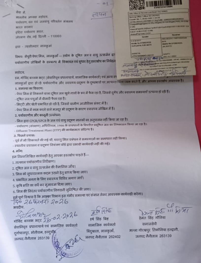 औद्योगिक नगरी लालकुआं में बढ़ते प्रदूषण को लेकर लोगों का आक्रोश खुलकर सामने आ गया है। क्षेत्र में फैली तीखी दुर्गंध, धुएं और प्रदूषित पानी से परेशान नागरिकों की ओर से समाजसेवियों ने सेंचुरी पल्प एंड पेपर मिल के खिलाफ पर्यावरण, वन एवं जलवायु परिवर्तन मंत्रालय और राष्ट्रीय हरित अधिकरण (एनजीटी) को शिकायत भेजकर तत्काल कार्रवाई की मांग की है।