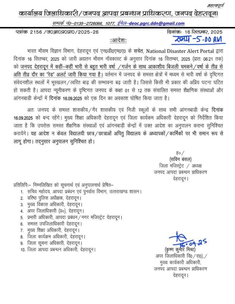 देहरादून : भारी बारिश के चलते आज सभी स्कूलों की छुट्टी रहेगी आदेश जारी....