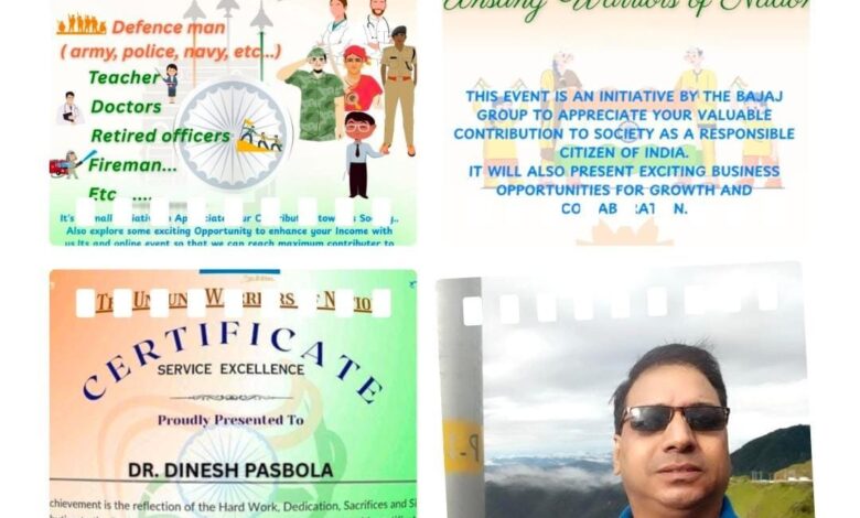 डॉ० डी० सी० पसबोला को राष्ट्रीय स्तर पर मिला प्रतिष्ठित “The Unsung Warriors Of Nation” सम्मान