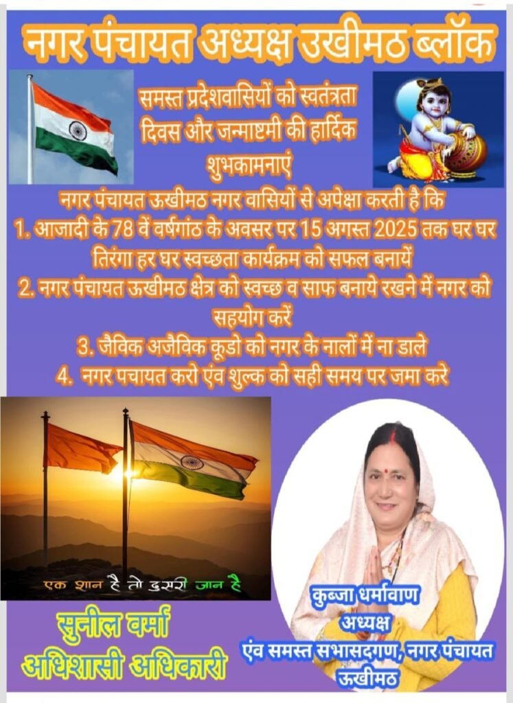 बता दे कि नगर पंचायत ऊखीमठ व खण्ड विकास अधिकारी और तहसील ऊखीमठ में भी झण्डारोहण के साथ आजादी का त्यौहार मनाया गया इस बीच समस्त विभागों के अधिकारी व कर्मचारी मौके पर मौजूद रहें।