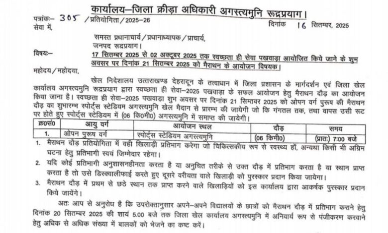 स्वच्छता ही सेवा पखवाड़े के तहत 17 सितम्बर से 2 अक्टूबर तक चल रहे विशेष अभियान के अंतर्गत 21 सितम्बर 2025 को अगस्त्यमुनि मैराथन (6 किलोमीटर) पुरुष वर्ग ओपन का आयोजन किया जाएगा।