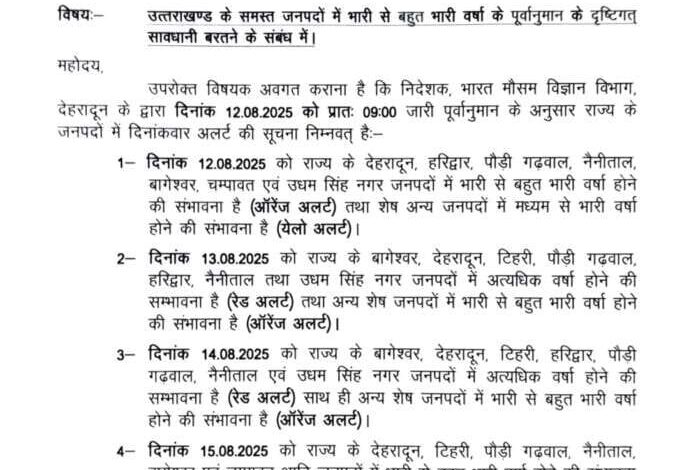 1- 12.08.2025 को राज्य के देहरादून, हरिद्वार, पौड़ी गढ़वाल, नैनीताल, बागेश्वर, चम्पावत एवं उधम सिंह नगर जनपदों में भारी से बहुत भारी वर्षा होने की संभावना है (ऑरेंज अलर्ट) तथा शेष अन्य जनपदों में मध्यम से भारी वर्षा होने की संभावना है (येलो अलर्ट)।