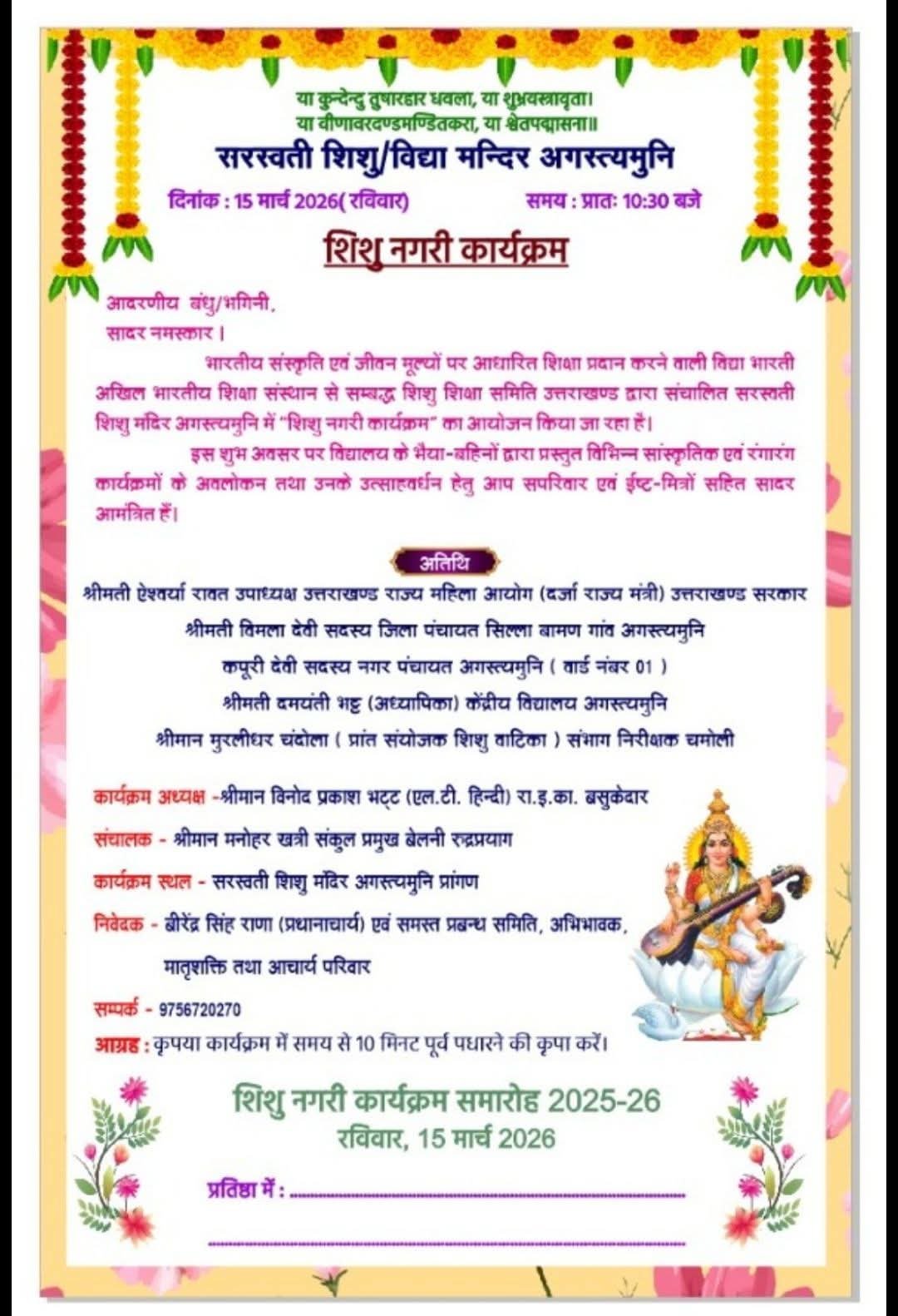 उन्होंने कहा कि कार्यक्रम में प्रशांत सहयोगी मुरलीधर चंदोला, व मुख्य सहयोगी ममता जी द्वारा किया गया वहीं कार्यक्रम में बतौर मुख्य अतिथि दर्जा धारी राज्य मंत्री शैलपुत्री ऐश्वर्या रावत ने बातोर मुख्यातिथि शिरकत करते हुए सरस्वती शिशु मंदिर अगस्त्यमुनि के समस्त छात्र छात्राओं व शिक्षकों को कार्यक्रम की बधाई व शुभकामनाएं दी वहीं राज्य मंत्री शैलपुत्री ऐश्वर्या रावत ने कहा कि इस प्रकार की विघालय में प्रतियोगिता होने से विघालय में पढ रहे छात्र छात्राओं को ज्यादा ज्ञान मिलता है और साथ ही सभी छात्र छात्राओं का आत्मविश्वास बढ जाता है रावत ने कहा कि आज के युग में सबसे पहले शिक्षा है जिससे हर एक युवा व छात्र छात्राओं और आम जनमानस अपनी जीवन की शुरुआत करते हैं इस मौके पर नगर पंचायत अगस्त्यमुनि की सदस्य कपूरी देवी, कार्यक्रम अध्यक्ष विनोद प्रकाश भट्ट, कार्यक्रम संचालक मनहोर खाती, दम्वती भट्ट सहित अन्य अधिकारी उपस्थित रहे
