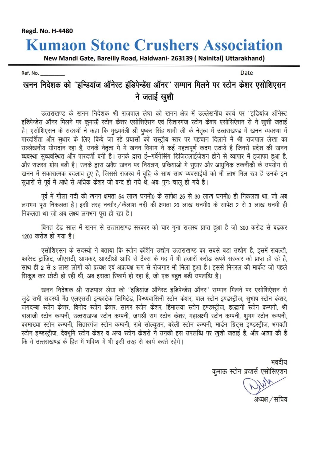 उत्तराखण्ड के खनन निदेशक राजपाल लेघा को खनन क्षेत्र में उल्लेखनीय कार्य पर इडियांज आनेस्ट इंडिपेन्डेंस आनर मिलने पर कुमाऊॅ स्टोन के्शर एसोशिऐसन एवं सितारगंज स्टोन क्रेषर एसोसिऐशन से ने खुशी जताई है।