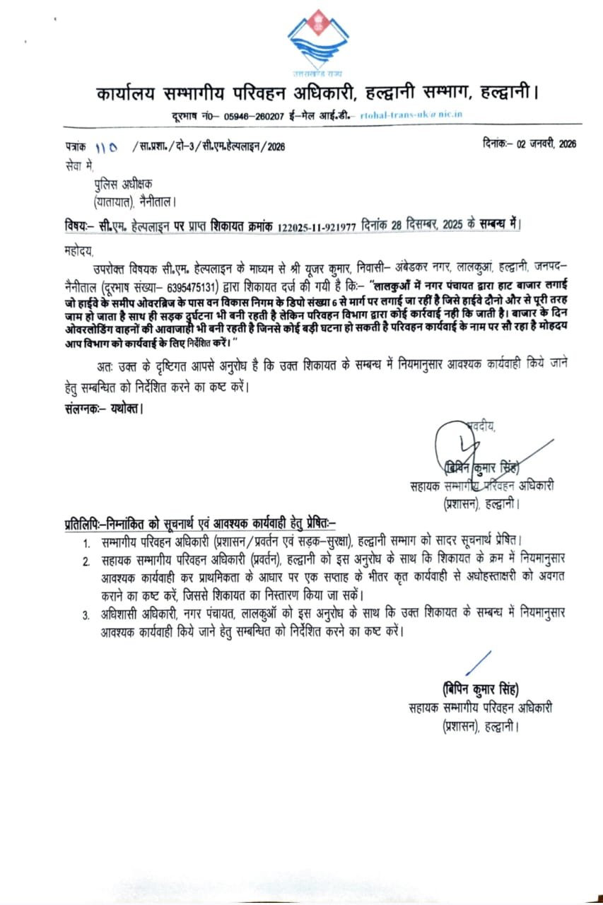 बताते चले कि यहाँ अबेडकर नगर, लालकुआं निवासी मुकेश कुमार ने 28 दिसंबर 2025 को सीएम हेल्पलाइन पर शिकायत दर्ज कर आरोप लगाया कि बाजार के दिन हाईवे पूरी तरह अवरुद्ध हो जाता है। साथ ही ओवरलोड वाहनों की आवाजाही लगातार बनी रहती है, जिससे किसी बड़ी दुर्घटना की आशंका बनी हुई है। शिकायतकर्ता का आरोप है कि परिवहन विभाग द्वारा इस पर कोई प्रभावी कार्रवाई नहीं की जा रही है।