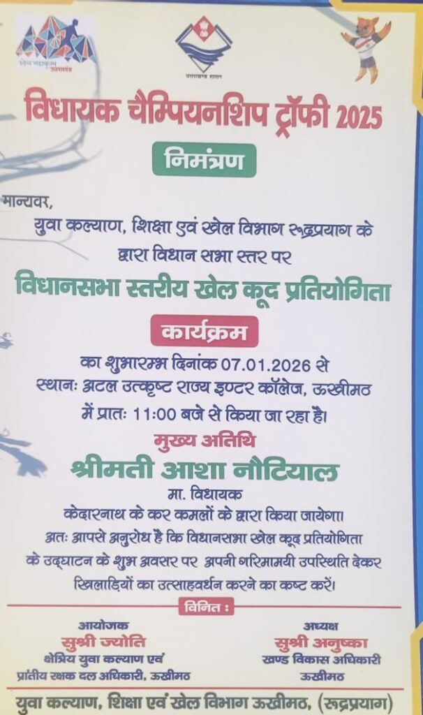 वहीं खण्ड विकास अधिकारी ऊखीमठ अनुष्का ने बताया कि विधानसभा स्तरीय खेल महाकुंभ 2025 के विधायक चैम्पियनशिप ट्राफी का शुभारंभ 7 जनवरी 2026 से अटल उत्कृष्ट राजकीय इण्टर कालेज ऊखीमठ के मैदान किया जाएगा।